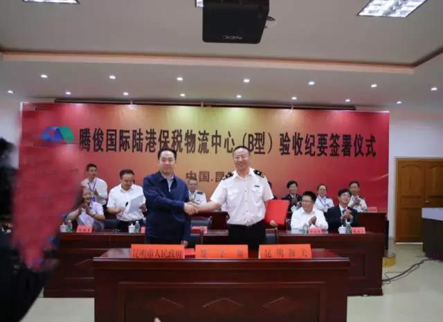 昆明海關(guān)副關(guān)長馬軍與昆明市人民政府副市長洪維智簽署了《騰俊國際陸港保稅物流中心基礎(chǔ)和監(jiān)管設(shè)施驗收紀(jì)要》。昆明市人民政府高庚副秘書長、晉寧區(qū)人民政府李福軍區(qū)長、昆明市商務(wù)和投資促進局徐增雄局長、及省、市、區(qū)各級有關(guān)部門負(fù)責(zé)人參加了驗收工作。